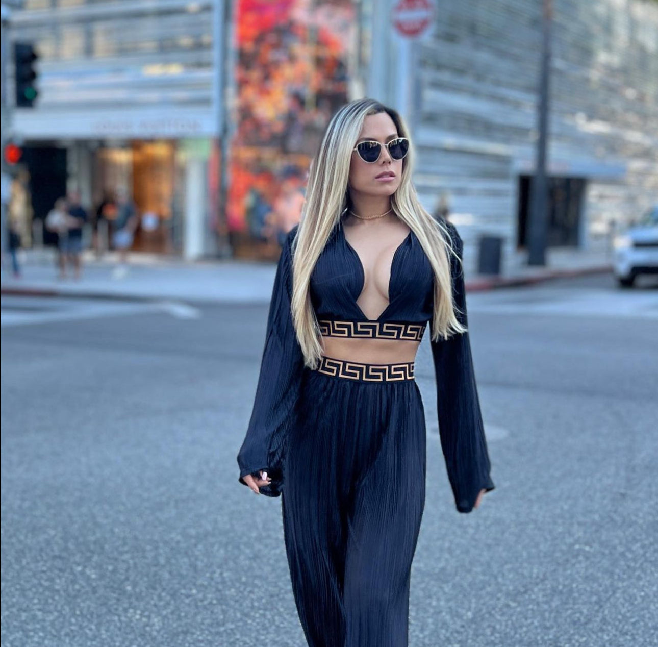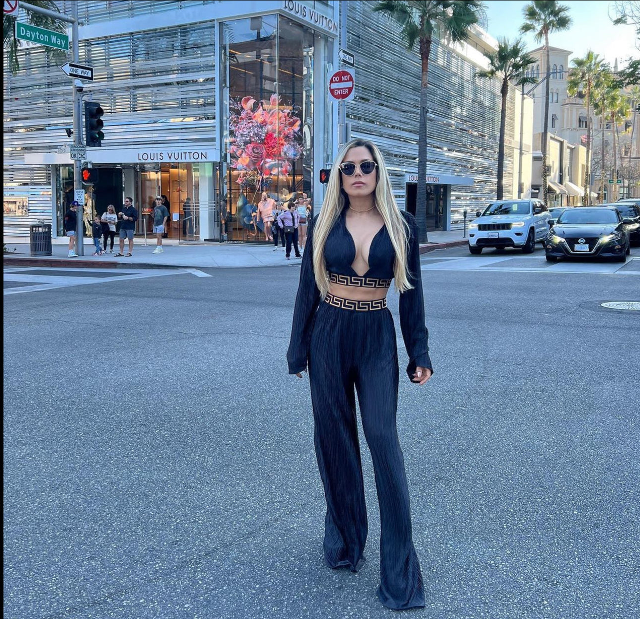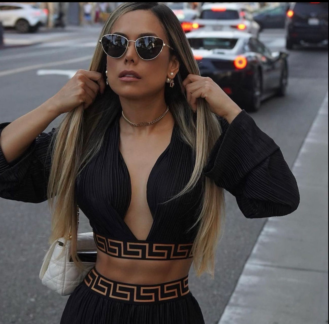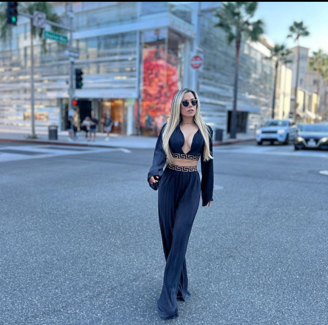A sleek black outfit, embodying elegance and modernity. The ensemble, characterized by its tailored fit and sophisticated design, accentuates her poise and style. Ideal for showcasing versatility and chic appeal, this visual is a testament to the power of simplicity in fashion.
