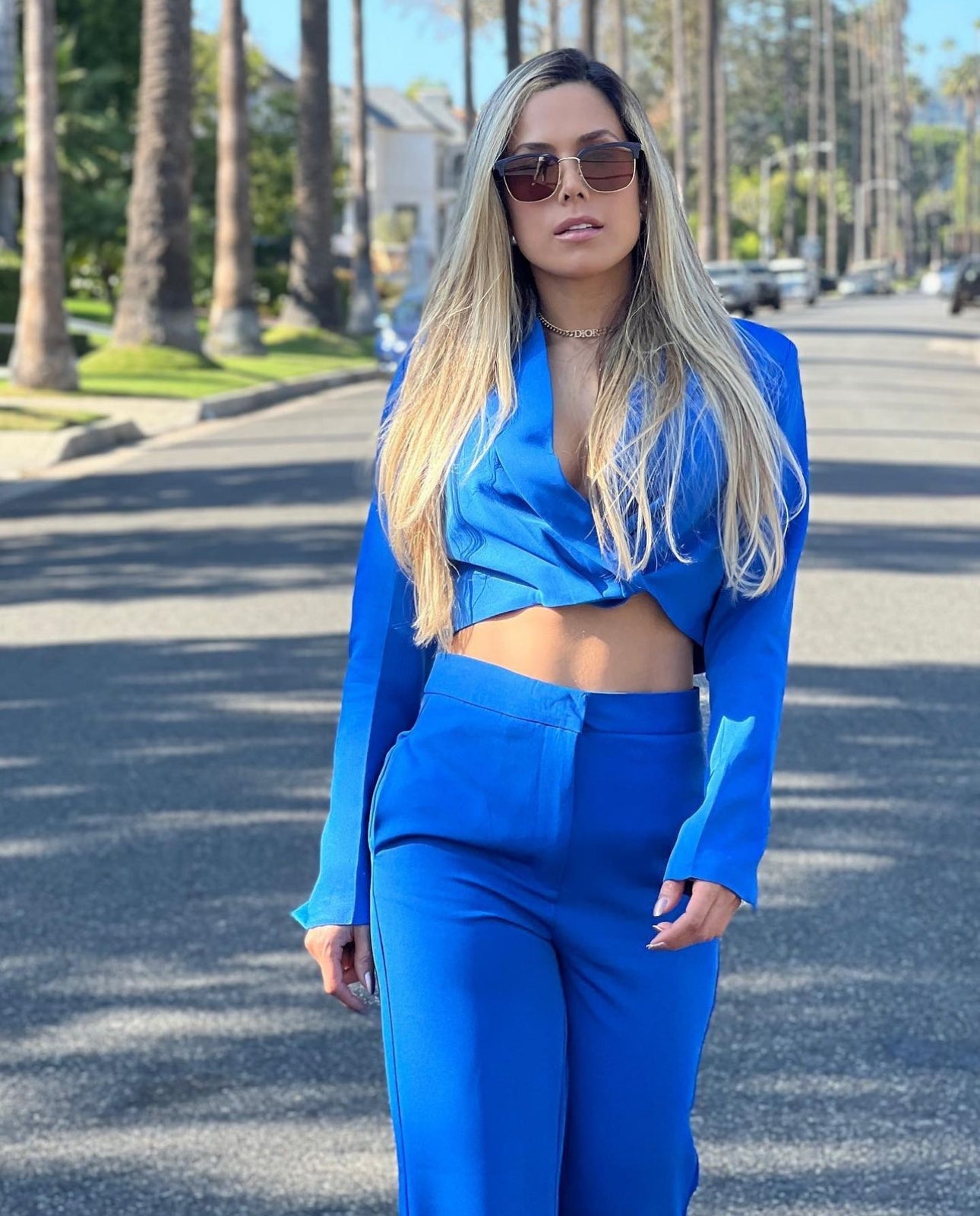 This striking image features a confident woman dressed in a tailored blue suit, exuding professionalism and style.